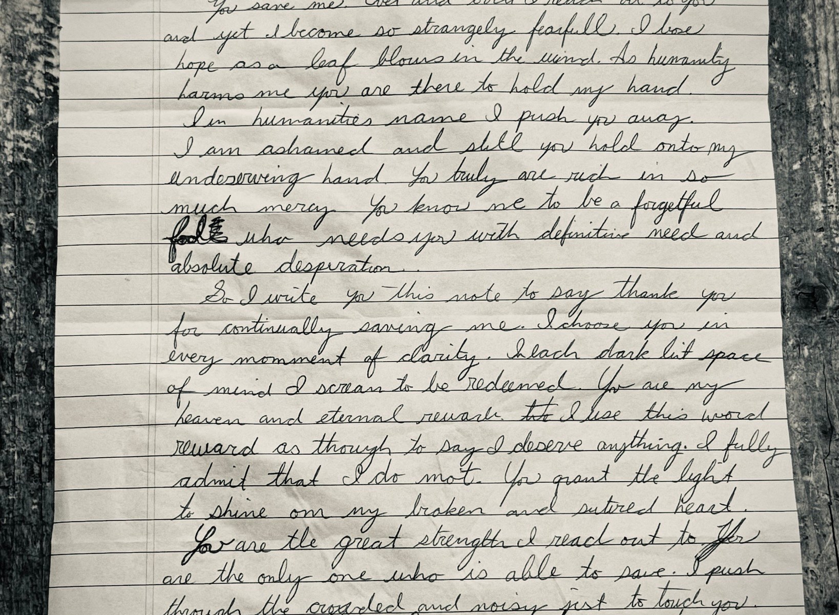 So I write you this note to say thank you for continually saving me. I choose you in every moment of clarity. In each dark lit space of mind I scream to be redeemed. You are my heaven and eternal reward. I use this word reward as though to say I deserve anything. I fully admit that I do not. You grant the light to shine on my broken and sutured heart.